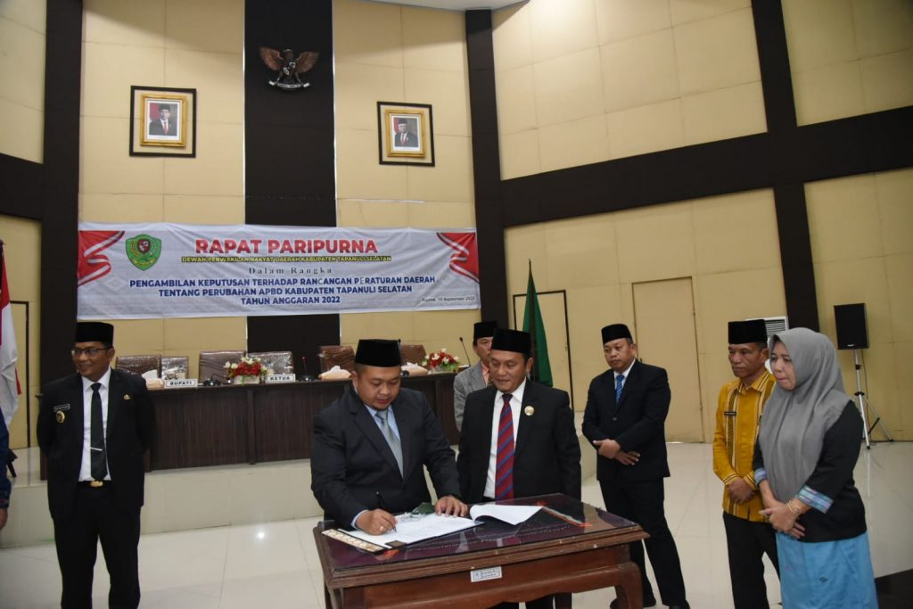 TAPSEL-Bupati Tapanuli Selatan (Tapsel) H Dolly Pasaribu dan Dewan Perwakilan Rakyat Daerah (DPRD) menandatangani persetujuan bersama Rancangan Peraturan Daerah (Ranperda) tentang Perubahan APBD Kabupaten Tapsel Tahun Anggaran 2022. Persetujuan tersebut ditandatangani Bupati dan DPRD pada sidang paripurna di Gedung DPRD Kabupaten Tapsel Jalan Prof. Lafran Pane, Sipirok, Kamis (15/9).