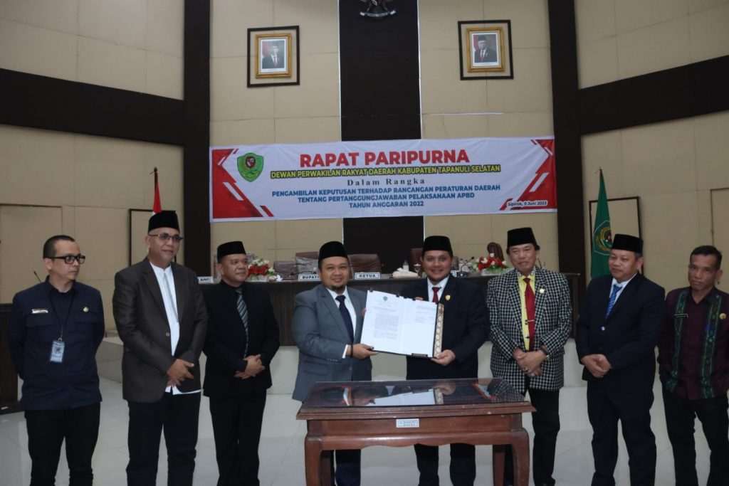 "Atas upaya dan tenaga serta pemikiran yang telah kita darma baktikan demi terwujudnya pembangunan daerah, sehingga rancangan peraturan daerah (Ranperda) tentang Pertanggungjawaban Pelaksanaan APBD Kabupaten Tapanuli Selatan tahun anggaran 2022 ini dapat disetujui bersama," ujar Dolly.
