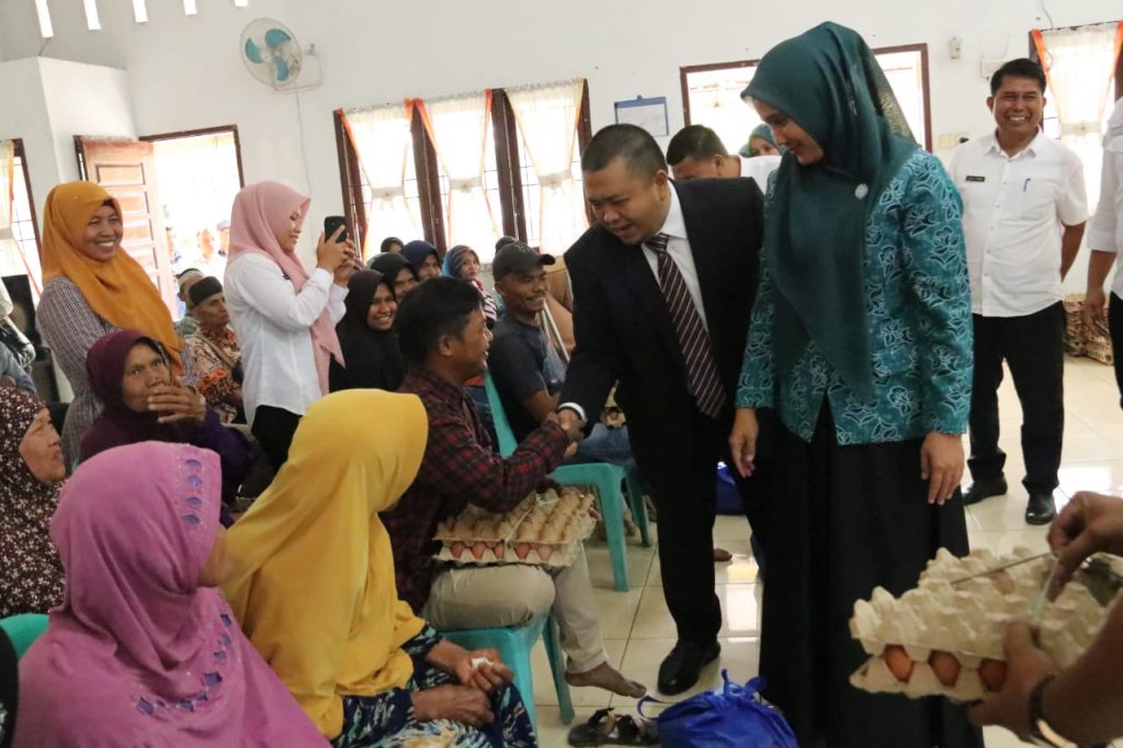 TAPSEL-Bupati Tapanuli Selatan (Tapsel), H Dolly Pasaribu, dan Ketua TP PKK, Ny Rosalina Dolly Pasaribu, memberikan bantuan sosial berupa beras, telur, minyak goreng, susu kaleng, dan kerupuk kepada warga Angkola Timur di Aula Kantor Camat setempat, Rabu (28/12).