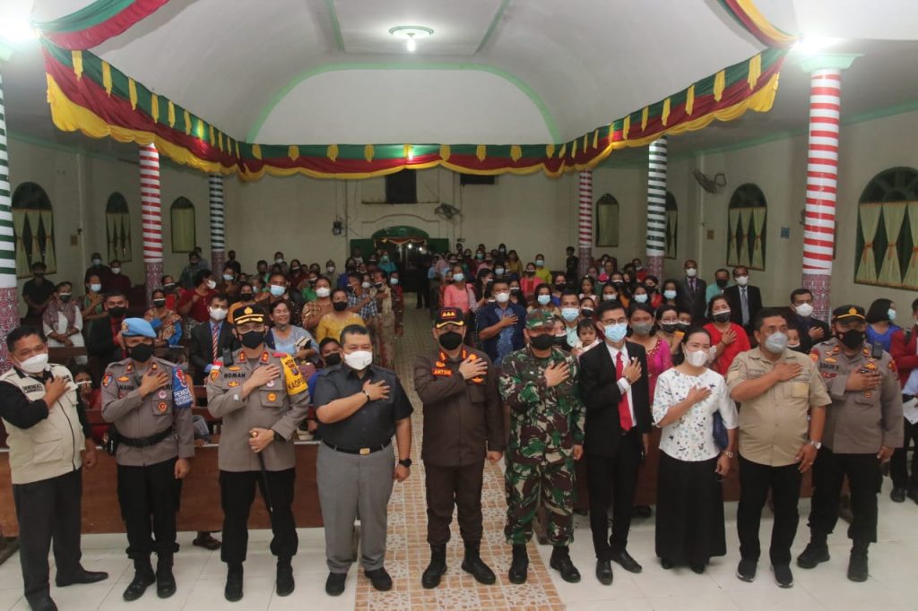 TAPANULI SELATAN-Bupati Tapanuli Selatan (Tapsel), H Dolly Pasaribu, SPt, MM bersama Kapolres, AKBP Roman Smaradhana Elhaj, SH, SIK, MH dan Kajari Tapsel, Antoni Setiawan, SH, MH meninjau pelaksanaan ibadah Natal disejumlah gereja, Jumat (24/12/2021) malam.