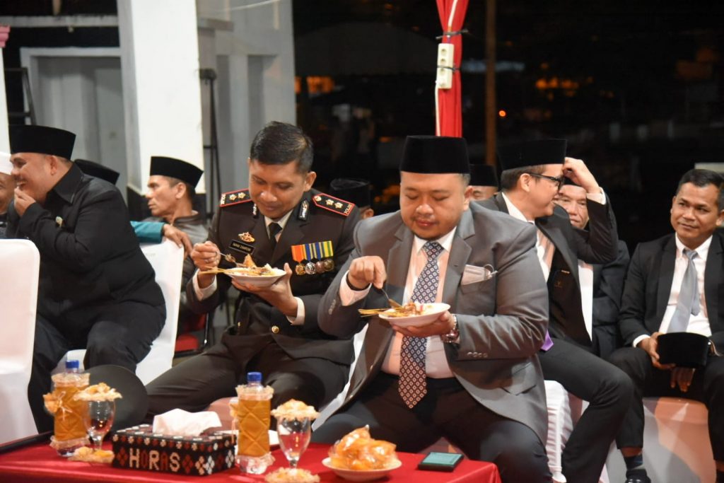 TAPSEL-Bupati Tapanuli Selatan (Tapsel) Dolly Pasaribu dan Forum Komunikasi Pimpinan Daerah (Forkopimda) terlihat kompak menikmati makan sate gerobak saat berada di atas panggung kehormatan disela acara malam penetapan waktu (Taptu) atau pawai obor dalam menyambut HUT Republik Indonesia Ke-78 di Adian Pardomuan Sipirok, Kecamatan setempat, Rabu (16/8) malam.