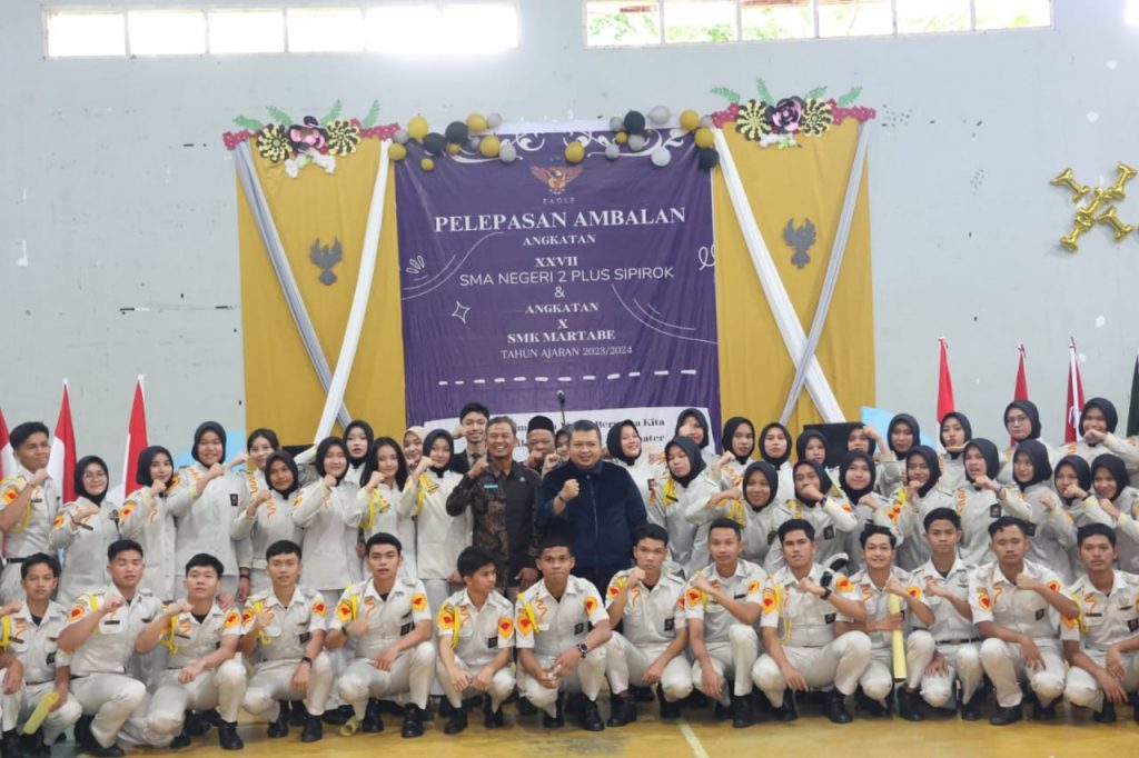 TAPANULI SELATAN – Bupati Tapanuli Selatan (Tapsel) Dolly Pasaribu bertindak sebagai Inspektur Upacara (Irup) pada pelepasan ambalan siswa SMA Negeri 2 Plus Sipirok angkatan 27 dan SMK Martabe Sipirok angkatan 10, di Gedung Olahraga (GOR) SMAN 2 Plus Sipirok, Sabtu (2/3).