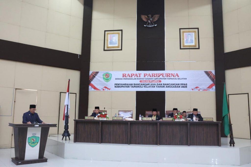 Tapanuli Selatan — Bupati Tapanuli Selatan (Tapsel) H. Gus Irawan Pasaribu menyampaikan Rancangan Kebijakan Umum Anggaran (KUA) dan Prioritas Plafon Anggaran Sementara (PPAS) Tahun Anggaran 2026 pada rapat paripurna DPRD Tapsel, Senin (10/11/2025) di gedung dewan, Jalan Prof. Lafran Pane, Sipirok.