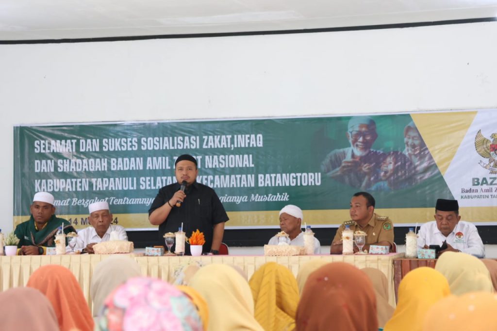 TAPSEL – Bupati Tapanuli Selatan (Tapsel) Dolly Pasaribu membuka secara resmi Sosialisasi Zakat, Infaq, dan Shadaqah kepada Kepala Sekolah SD dan SMP, Kepala Puskesmas, Lurah/Kepala Desa se-Kecamatan Batang Toru di Aula Kantor Camat Batang Toru, Selasa (14/5).