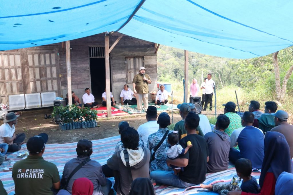 TAPSEL-Bupati Tapanuli Selatan (Tapsel), H Dolly Pasaribu, menyerahkan secara simbolis bibit kopi dan ternak ayam, pada Rabu (28/12) di Desa Sampean, Kecamatan Sipirok.