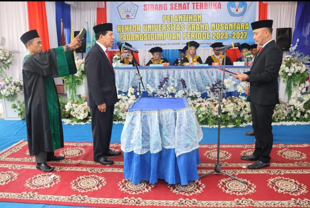 TAPANULI SELATAN-Ketua Pembina Yayasan Dharma Bhakti Pendidikan Indonesia (YADPI), Sofyan Adil melantik Dr. Drs. Burhanuddin, M.Pd, sebagi Rektor Universitas Graha Nusantara Padangsidimpuan (UGNP) Periode 2023-2027 di Aula Kampus III UGNP, Kelurahan Sihitang, Kota Padangsidimpuan, Senin (11/12) yang dihadiri para pejabat tinggi lingkungan Tapsel dan Kota Padangsidimpuan.