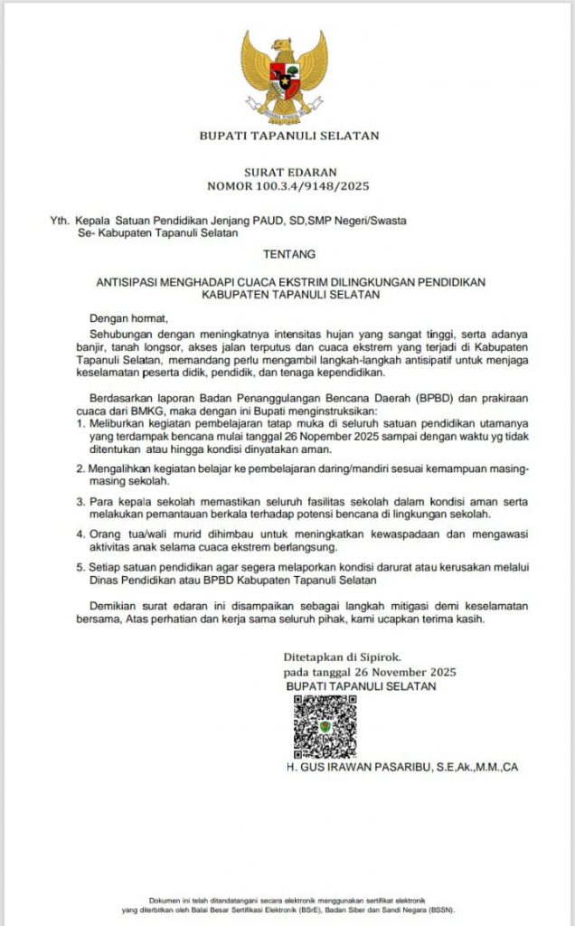 Bupati Tapanuli Selatan (Tapsel), H. Gus Irawan Pasaribu, resmi mengeluarkan Surat Edaran Nomor 100.3.4/9148/2025 yang ditujukan kepada seluruh satuan pendidikan mulai dari PAUD hingga SMP, baik negeri maupun swasta. Surat edaran dikeluarkan Bupati pada Rabu (26/11/2025).