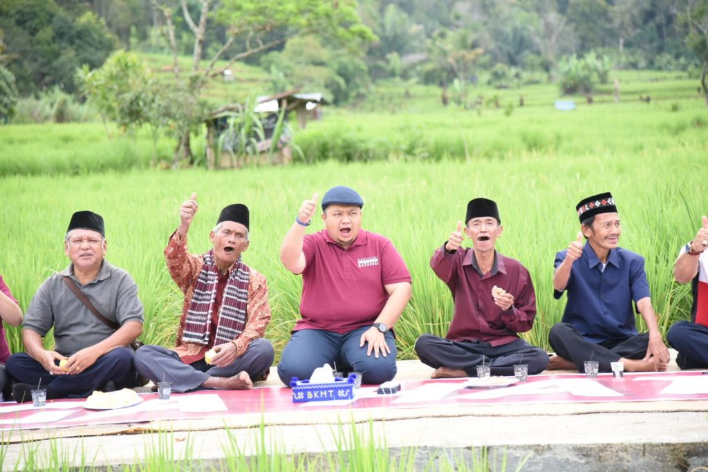 TAPSEL-Ditengah hamparan sawah, Bupati Tapanuli Selatan (Tapsel) H Dolly Pasaribu "Ngopi Bareng" bersama masyarakat adat HATABOSI di Dusun Bonan Dolok, Desa Tanjung Dolok, Kecamatan Marancar, Kabupaten Tapsel, Jumat (14/10).