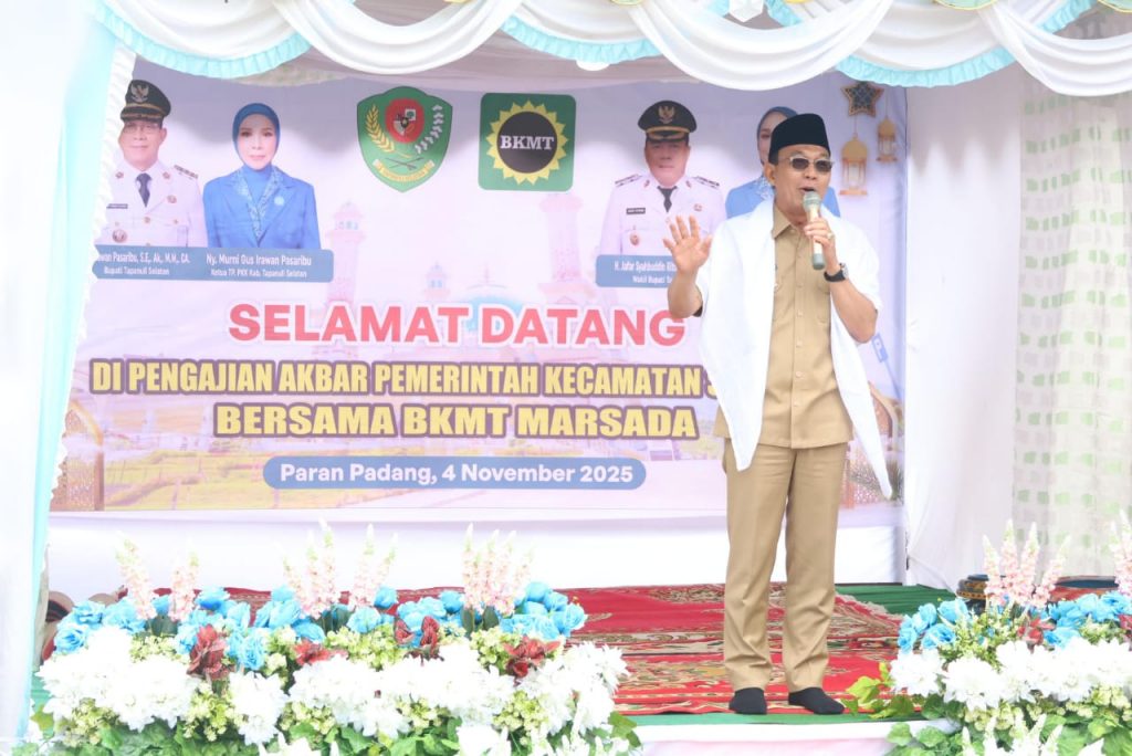 Tapanuli Selatan – Bupati Tapanuli Selatan (Tapsel) H. Gus Irawan Pasaribu menyampaikan rasa syukur dan semangat kebersamaan dalam acara Pengajian Akbar Kecamatan bersama Badan Kontak Majelis Taklim (BKMT) Marsada di Desa Paran Padang, Kecamatan Sipirok, Selasa (4/11/2025).