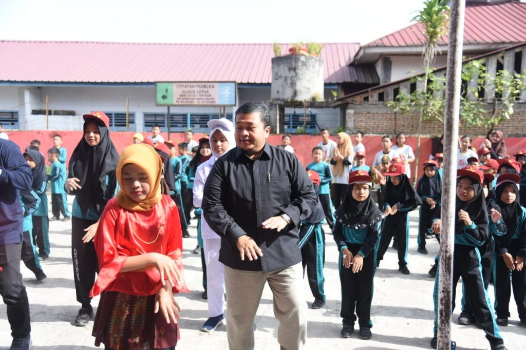 TAPSEL-Bupati Tapanuli Selatan (Tapsel) Dolly Pasaribu didampingi Kadis Pendidikan dan Camat Sipirok melakukan senam pagi bersama siswa-siswi PAUD, SD dan SMP di lapangan SD Negeri 101201 Sipirok, Jumat (28/7).