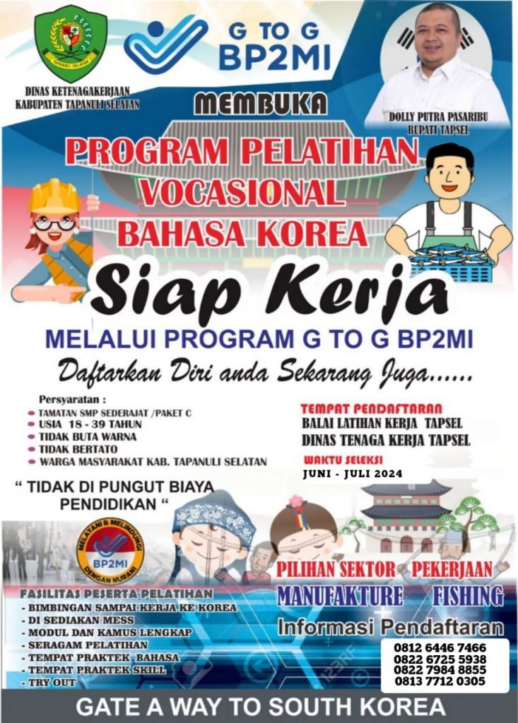 TAPSEL – Pemerintah Kabupaten (Pemkab) Tapanuli Selatan (Tapsel) melalui Dinas Ketenagakerjaan membuka Program Pelatihan Vocasional Bahasa Korea melalui Program G to G BP2MI di UPT Balai Latihan Kerja (BLK) Kabupaten Tapanuli Selatan, Jalan Siharang Karang, Lembah Lubuk Manik, Kecamatan Padangsidimpuan Hutaimbaru, Kota Padangsidimpuan, pada Jumat (24/5).