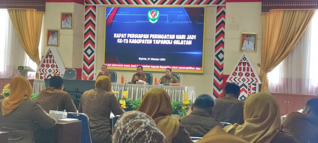 TAPSEL-Pemerintah Kabupaten (Pemkab) Tapanuli Selatan (Tapsel) menggelar rapat persiapan peringatan Hari Jadi Ke-73 Kabupaten Tapanuli Selatan Tahun 2023 di Aula Sarasi, Lantai III, Kantor Bupati setempat, Sipirok, Selasa (31/10).